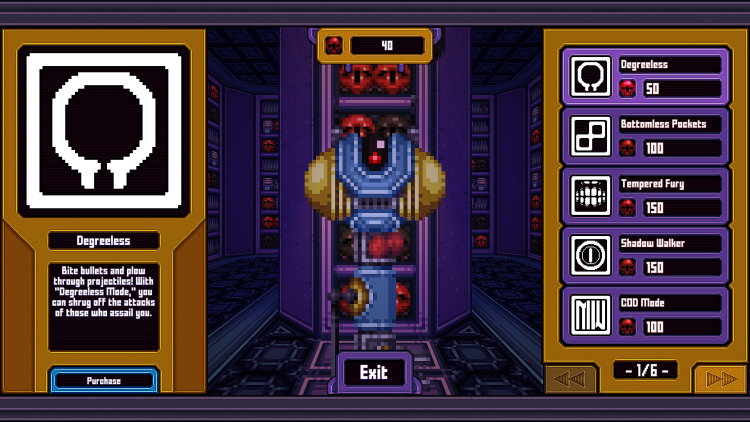 Drugą mechaniką ułatwiającą (lub utrudniającą) grę jest sklep w hubie, w którym za znajdowane w trakcie gry czerwone czaszki można kupić różne rodzaje modyfikatorów rozgrywki – takie jak nieśmiertelność, nieskończona amunicja, super szybkość itp. Jedyny szkopuł jest taki, że możemy z nich skorzystać tylko kiedy chcemy w dany etap zagrać ponownie po jego wczesniejszym ukończeniu. Nagrodą jest to, że ich użycie nie ma żadnego wpływu na możliwość odblokowywania kolejnych osiągnięć w grze.